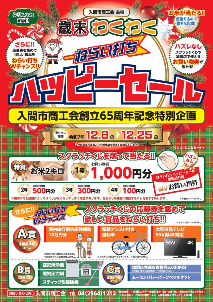 歳末わくわくねらい打ちハッピーセール 2025 12/08 2025年12月8日 入間市商工会創立65周年記念特別企画 【歳末わくわくねらい打ちハッピーセール】がはじまりました。皆様のご来店をお待ちしております。 お知らせ ハッピーセール 入間市 入間市商工会 年末年始 河内園 狭山茶